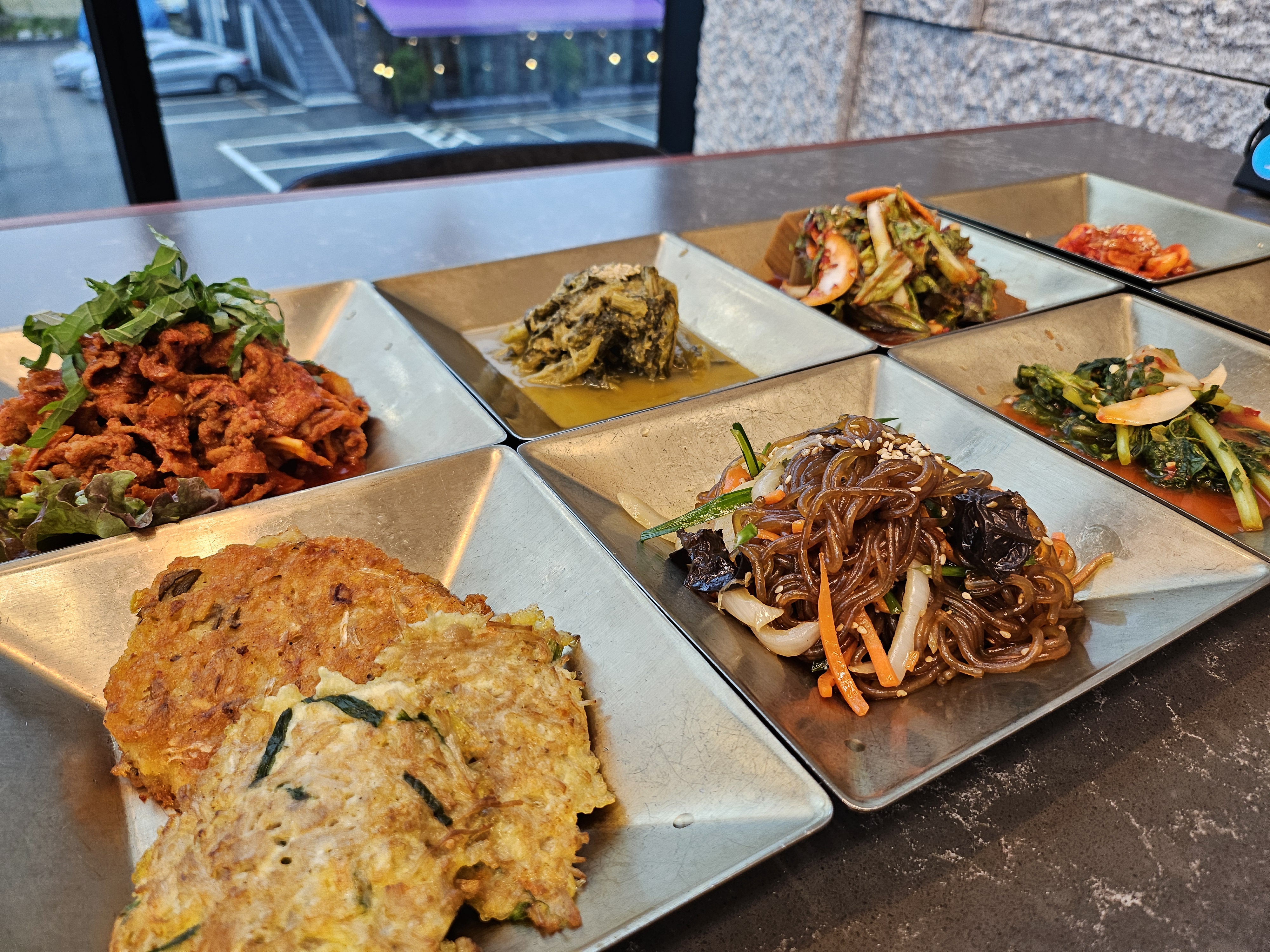 특히 인상적이었던 건 각종 나물 반찬들인데, 싱싱한 재료로 만들어서 건강한 맛이 났어요. 제육볶음, 잡채, 전 등 메인급 반찬들도 리필이 가능하다는 게 놀라웠어요.