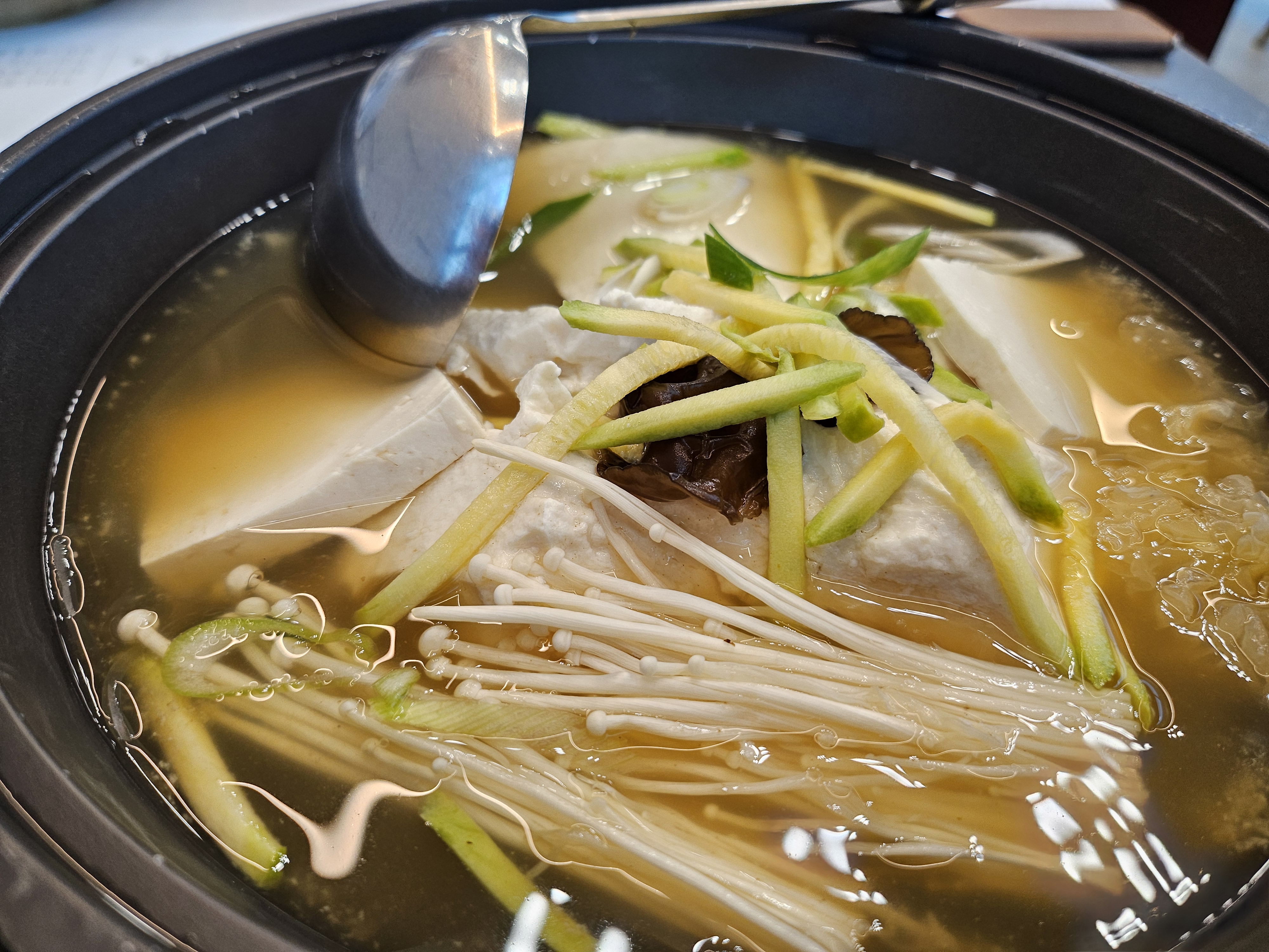 가장 먼저 나온 건 따끈한 두부 국이었어요. 직접 만든 두부를 사용한다고 하는데, 부드러우면서도 고소한 맛이 일품이에요. 냄비 가득 담겨 나와서 국물 좋아하시는 분들은 정말 만족하실 거예요.
