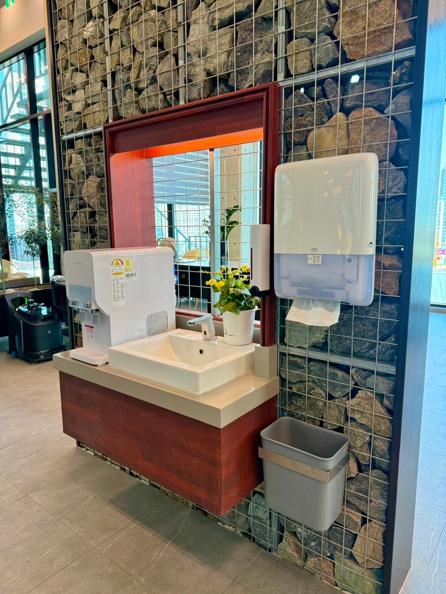 테이블 간격이 매우 넓어 다른 손님들과 부딪힐 일 없이 쾌적하게 식사할 수 있고, 곳곳에 배치된 세면대와 고급스러운 소품들이 세심함을 더해줘요. 돌담을 활용한 장식과 대형 어항, 그리고 살아있는 식물들이 자연스럽게 어우러진 공간 연출이 정말 멋있어요.